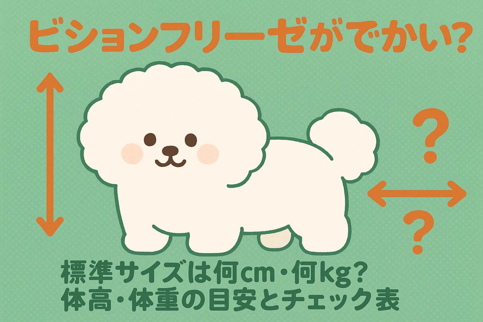 ビションフリーゼの標準サイズは、国内の犬種標準では体高25〜29cm、体重は体格とのバランスが取れた約5kgが目安です。見た目が「でかい」と感じる主因は、もこもこの毛量とカットによる膨張効果であることが多く、次に骨格差(個体差)、そして体脂肪の増加が続きます。まずは測る→基準と照合→ボディコンディションスコア(BCS)で落ち着いて確認しましょう。国内外の犬種標準(JKC/FCI/AKC)と獣医系のBCS資料(WSAVA)を踏まえて、わかりやすく整理します。